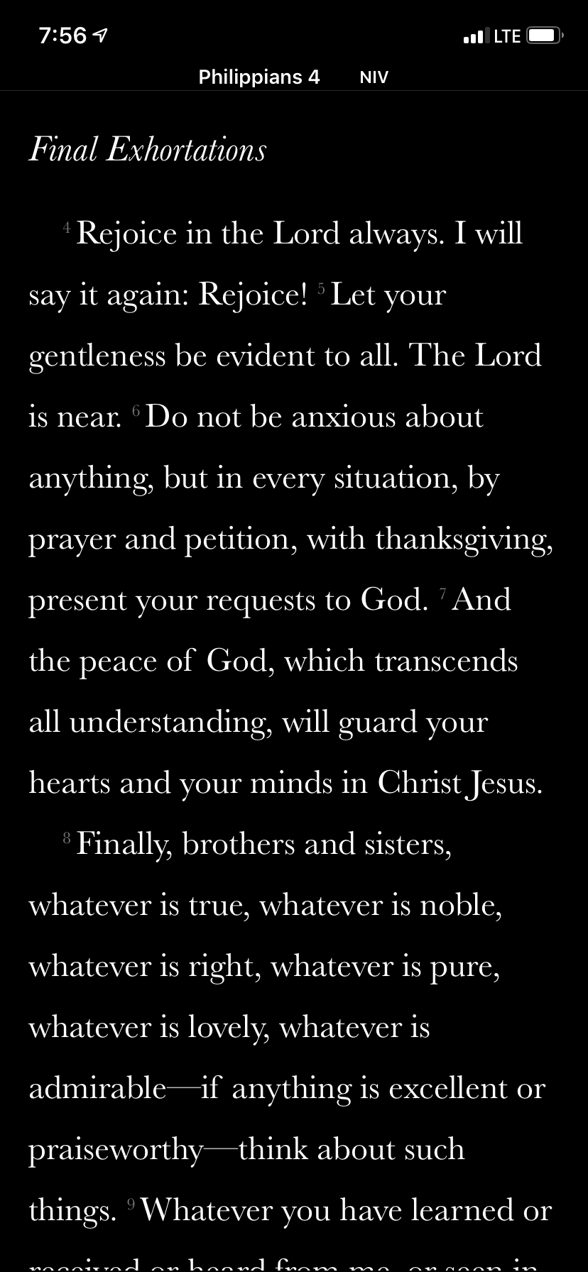 Philippians 4:4 Rejoice in the Lord always. I will say it again: Rejoice! 5 Let your gentleness be evident to all. The Lord is near. 6 Do not be anxious about anything, but in every situation, by prayer and petition, with thanksgiving, present your requests to God.7 And the peace of God, which transcends all understanding, will guard your hearts and your minds in Christ Jesus.